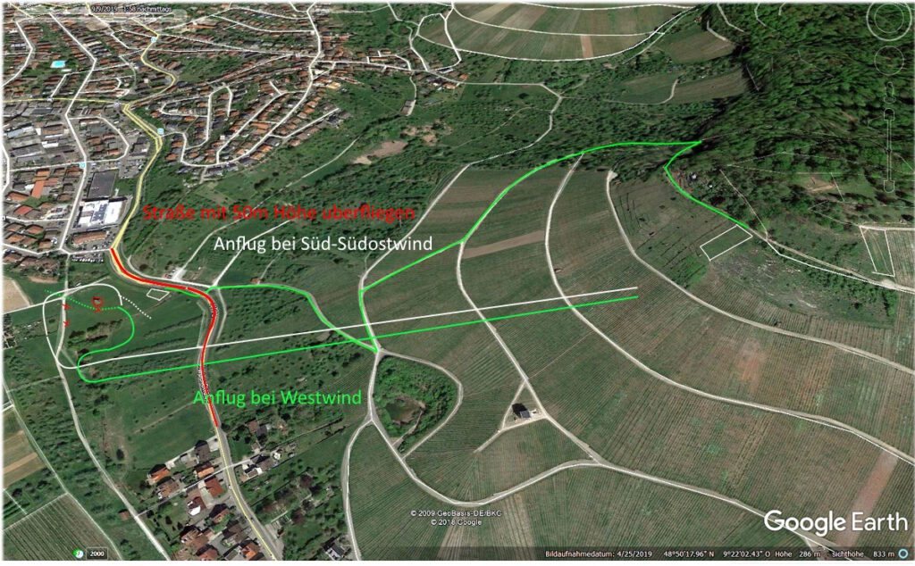 Der Landeplatz liegt direkt neben der Verbindungsstraße zwischen Kleinheppach und Korb vor dem Ortseingang Korb. Überflughöhe und Abstand zur Kreisstraße 1912 von mindestens 50 Metern zwingend einhalten. Landevolte darf nicht über Straße führen.