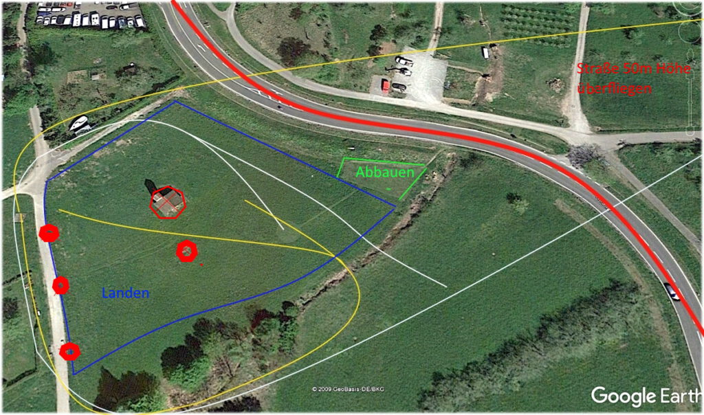 Mindestflughöhe über die Kreisstraße 50m und genügend Abstand zur Straße einhalten!